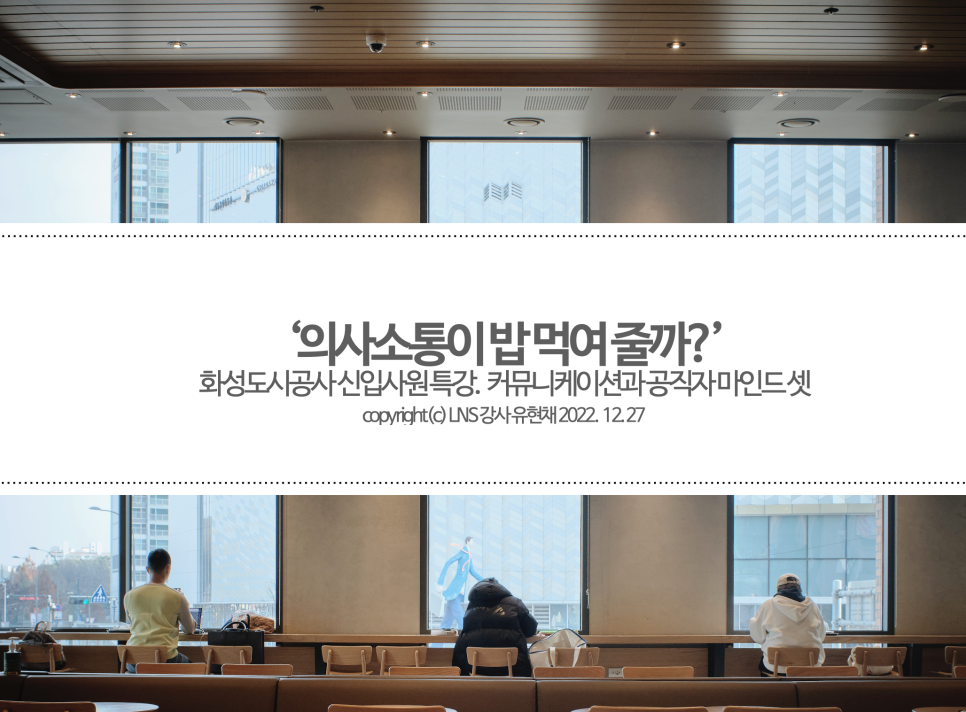 올해 기업 출강은 화성도시공사 신입사원 특강으로 시작했습니다. 화성도시공사에 새로 입사한 신입사원분들 대상으로 강의를 진행했는데요, 커뮤니케이션, 비즈니스 매너는 물론이고 제가 강조하는 인문학적 자세에 대해 이야기를 나눴습니다. 저와 나이 차이가 제법 나는 새내기 분들이라 그런지 에너지가 넘쳤던 자리였습니다. 이 글을 쓰고 있는 와중에도 기억이 나네요