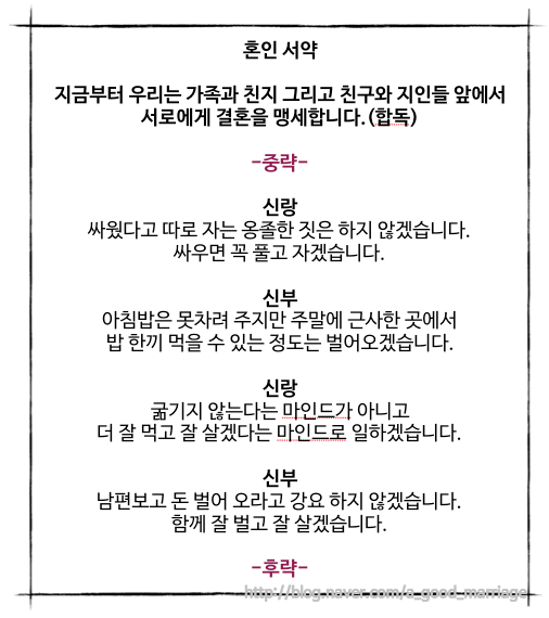그럼에도 적당한 길잡이가 있다면 좌충우돌을 줄일 수 있으니, 내 결혼식의 혼인서약서의일부를 발췌해 소개해본다.