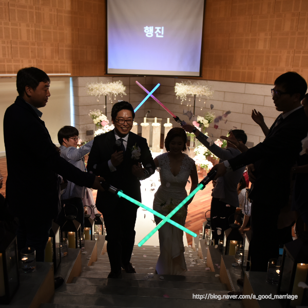 여기까지 마지막 한 순서를 남겨두고 모든 순서가 끝났다. 행진까지 하게되면 정말 유부남 유부녀가 되는 것이다. 이 마지막을 쉽게 보내줄 수 없다는(?)의미로 사회자 재량의 '이벤트'가 진행되곤 하지만, 요즘에는 보기 어려운 일이 되었다. 나도 권하지는 않는다. 모든 하객이 만족할 수 없는게 이벤트이기에 호불호가 갈릴 수 있다. 내 결혼식은 특별한 이벤트 없이 친구들이 예도를 해주는 것으로 구성했다. 음악은 스타워즈의 엔딩 테마로 골랐다.